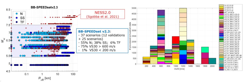 The BB-SPEEDset, introduced in Paolucci et al. (2021), is being under continuous development, as more processed numerical simulations become available. The dataset is currently in its 2.3 version, including a total of 20’046 three-component waveforms from earthquake scenarios with MW from 4.9 to 7.4 and Joyner-Boore distances (Rjb) up to 110 km. Strike-slip, normal and thrust events are included in the dataset. Concerning soil classes, the majority of the waveforms (about 76%) is on stiff soil with VS30 > 600 m/s; some waveforms (nearly 1%) are on very soft soil with VS30 less than 200 m/s.